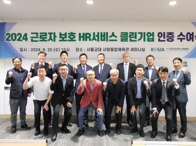 한국HR서비스산업협회(회장 김정현, 이하 협회)는 서울 서초동 서울교육대학교에서 '2024년도 근로자 보호 HR 서비스 클린기업 인증식'을 개최하며 올해 총 16개 아웃소싱 기업이 클린기업 인증을 받았다고 25일 밝혔다.