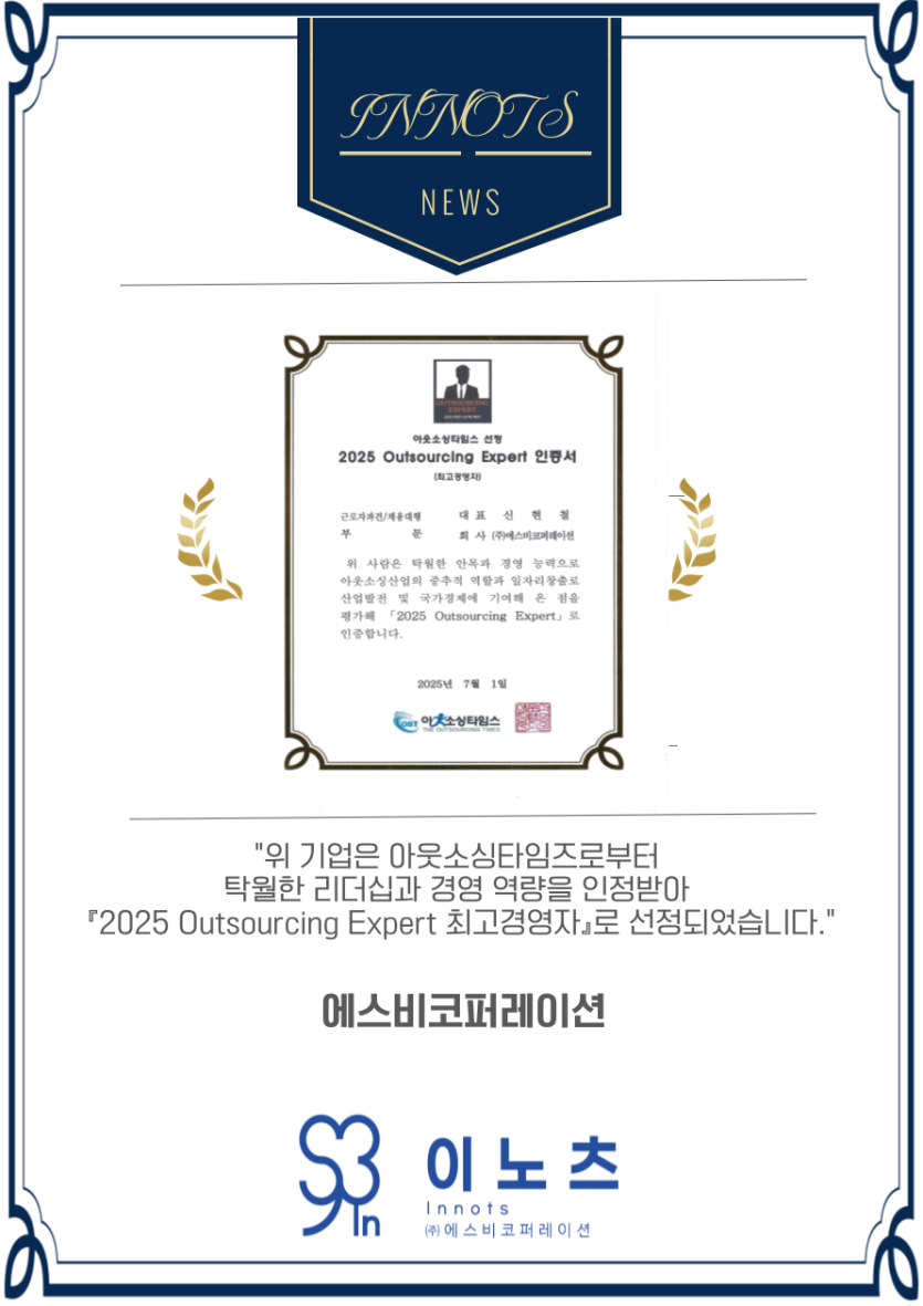 2025 아웃소싱타임즈 선정 최고경영자 인증 페이지 정보 작성자 관리자 댓글 0건 조회 67회 작성일 25-07-10 13:49 본문 2025 아웃소싱타임즈 선정 한 최고경영자 인증 목록 목록 이전글2025 대한민국 아웃소싱서비스 고객만족 대상수상 25.09.04 다음글100대 기업 아웃소싱 2년연속 선정 25.04.16